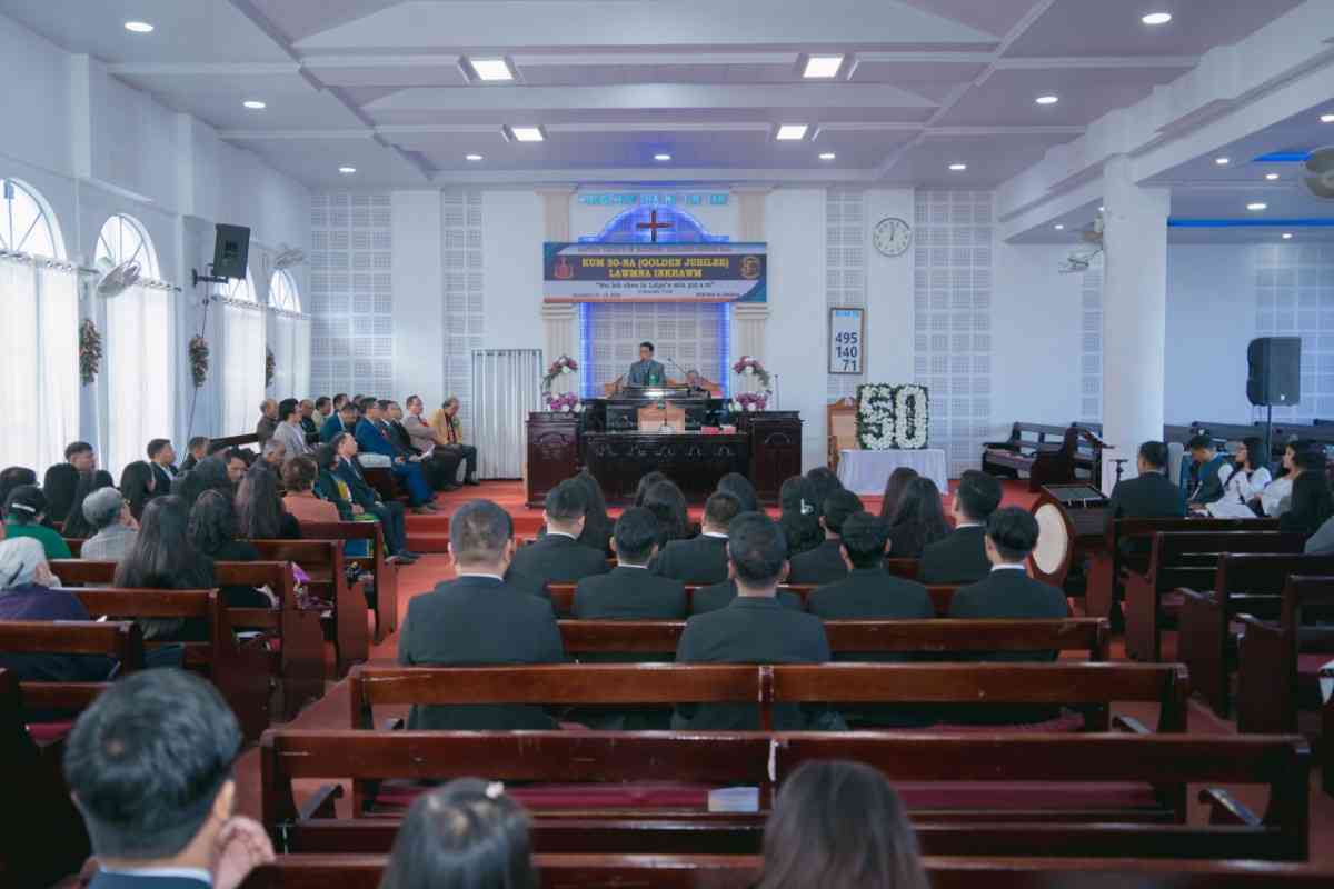 Golden Jubilee hi Pathianni leh Thawhtanni-ah lawm a ni a, Jubilee thupui tan “Hei leh chen Lalpa’n min pui a ni” ( ISamuela 7:12) chu hman a ni. Pathianni nilengin Jubilee pualin Inkhawmna hun hman a ni a, inkhawmah hian kohhran hrang hrang leh Missionary te atangin Greetings ngaihthlak a ni. Heng bakah hian zaipawl leh malzai ngaih nawm tak tak ngaihthlak a ni bawk.