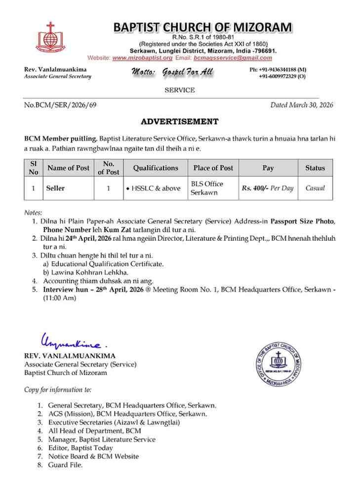 BCM Member puitling, Baptist Literature Service Office, Serkawn-a thawk turin a hnuaia hna tarlan hi a ruak a. Pathian rawngbawlnaa ngaite tan dil theih a ni e.